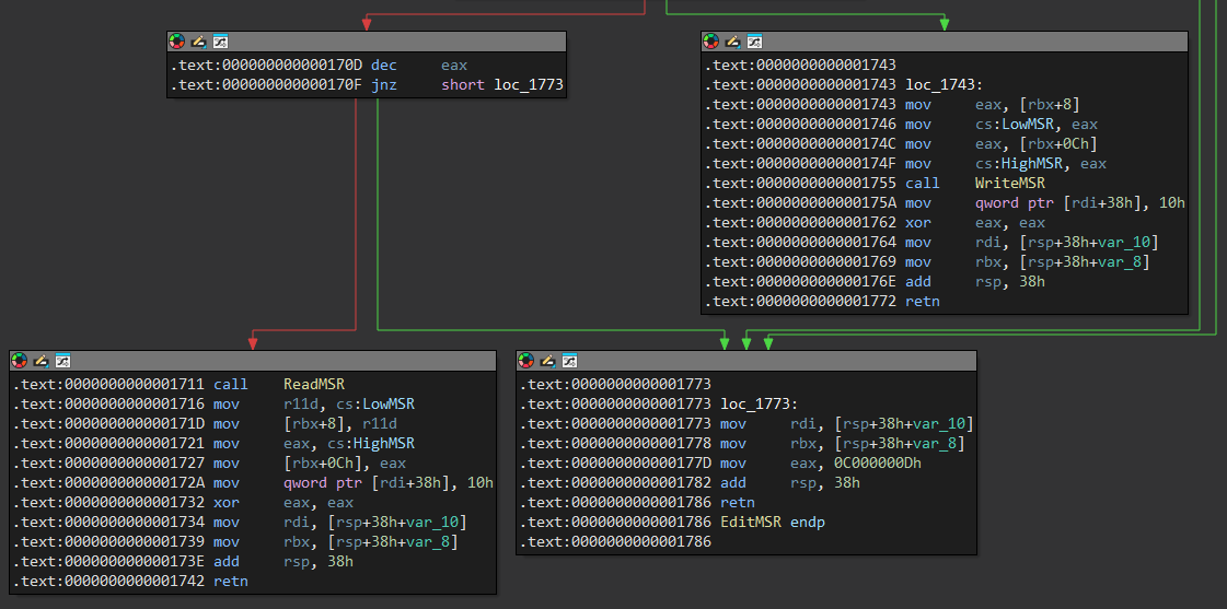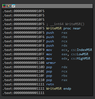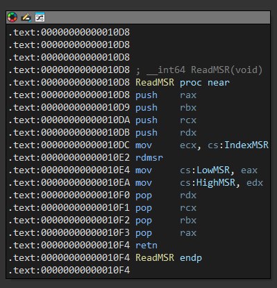 La función ReadMSR simplemente usa la instrucción rdmsr para guardar el valor del registro en ecx en edx:eax que luego guarda en las variables LowMSR y HighMSR.