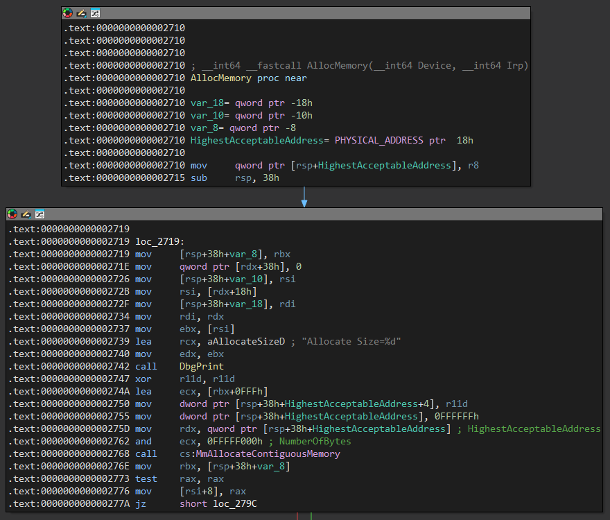 La función AllocMemory obtiene el Size de [rsi], osea desde el offset 0 de la entrada que es el único argumento, luego llama a MmAllocateContiguousMemory, esta función sirve para reservar memoria contigua y no paginada en el espacio de kernel.
