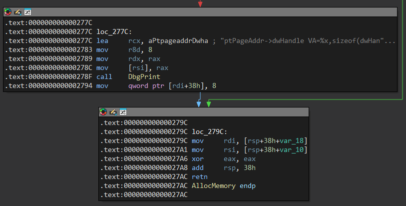 Vamos con otro de los códigos ioctl interesante, este se trata de 0xC3502800, cuando enviamos este código se llama a la función renombrada a AllocMemory.