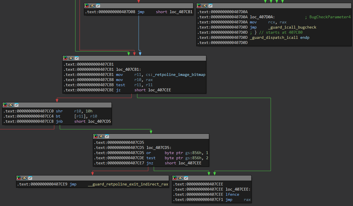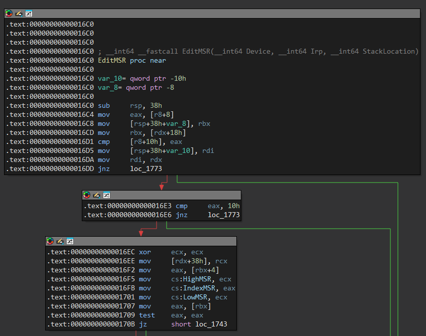 El driver inicia comparando el tamaño de la estructura con 16 bytes, después lee el dword en el offset 4 que corresponde al offset y lo mueve a IndexMSR, este será el registro que queremos usar, para fuinalizar el bloque termina comparando que el dword en el offset 0, si es 0 salta a la linea verde de lo contrario salta a la linea roja.