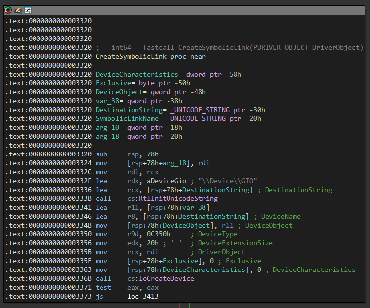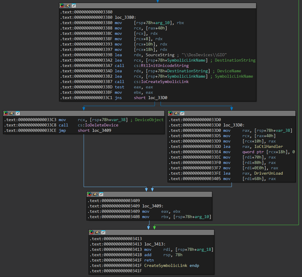 La función que renombramos CreateSymbolicLink se encarga de establecer un nombre de dispositivo con IoCreateDevice, en este casi le asigna \\.\GIO, como sabemos esta será es la forma en la que podemos comunicarnos con el driver.