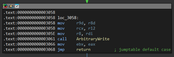 Si el byte es 0xe significa que haremos una solicitud a través de códigos ioctl, asi que inicia una estructura de tipo switch, revisaremos poco a poco las opciones iniciando por 0xC3502808, este código llama a una función llamada ArbitraryWrite.