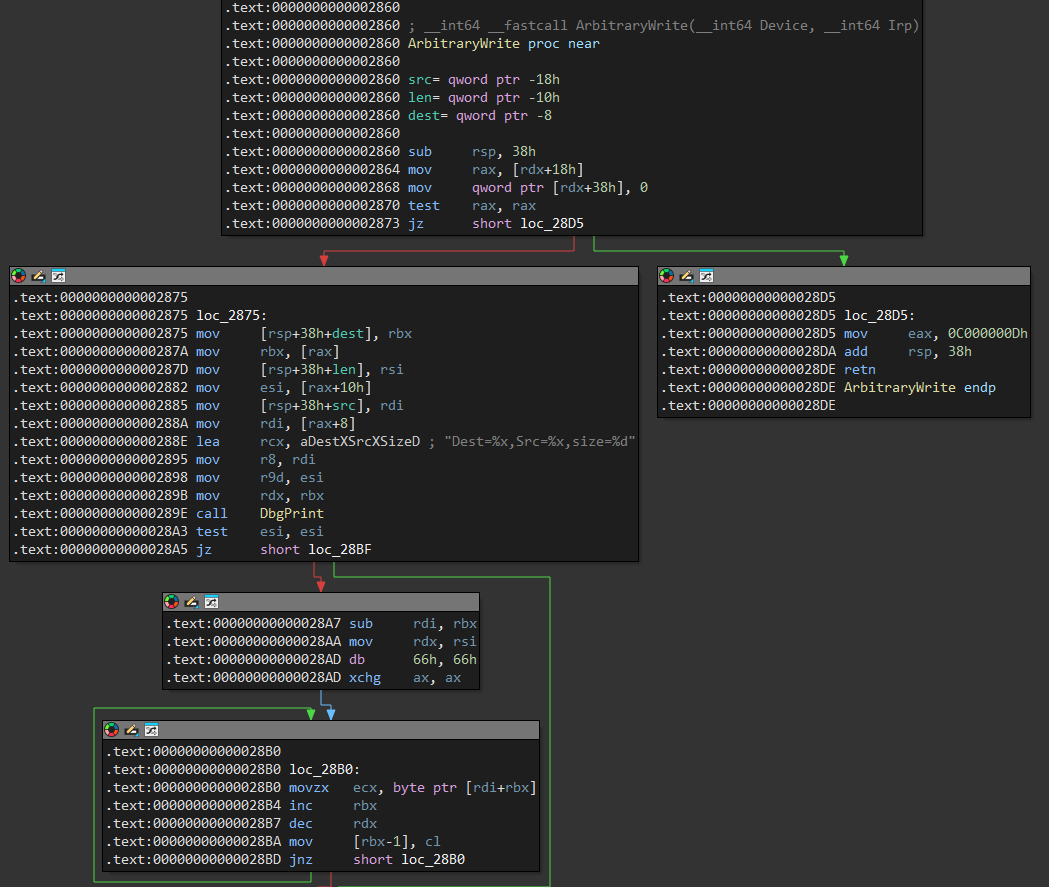 La función ArbitraryWrite luego de mostrar sus valores usando DbgPrint inicia un bucle, primero guarda en el registro rcx el byte de origen y lo escribe en el puntero de destino en rbx, esto lo hace la cantidad de veces que diga la longitud en rdx.