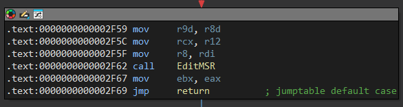 El siguiente código ioctl que vamos a analizar es 0xC3502580, este llama a una función que renombramos como EditMSR ya que nos permite jugar con sus valores.